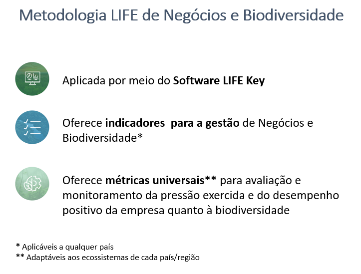 A Metodologia LIFE de Negócios e Biodiversidade é um instrumento que possibilita uma análise clara e objetiva da pressão, dos impactos (positivos e negativos), dos riscos, dependências e oportunidades na relação do negócio com a biodiversidade.
